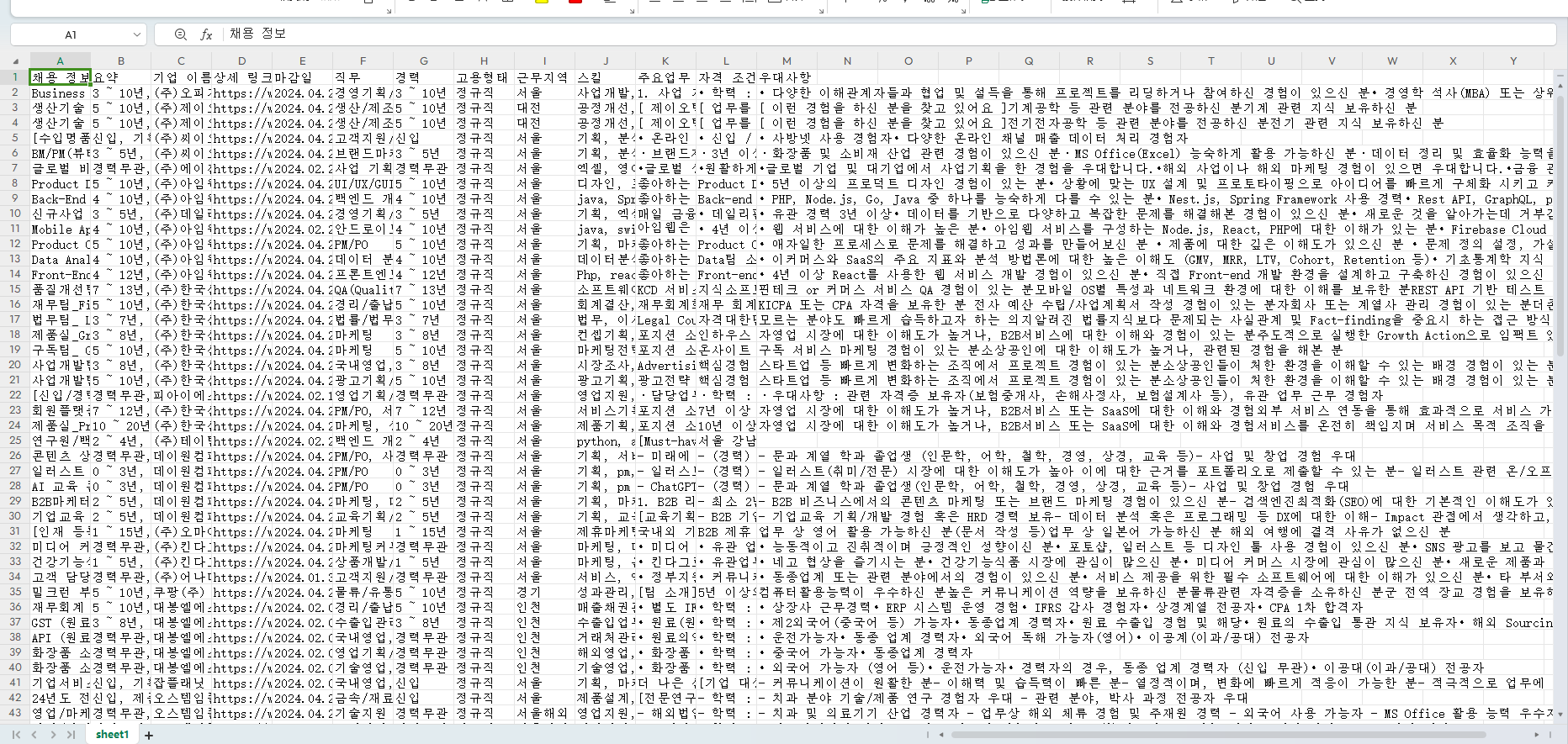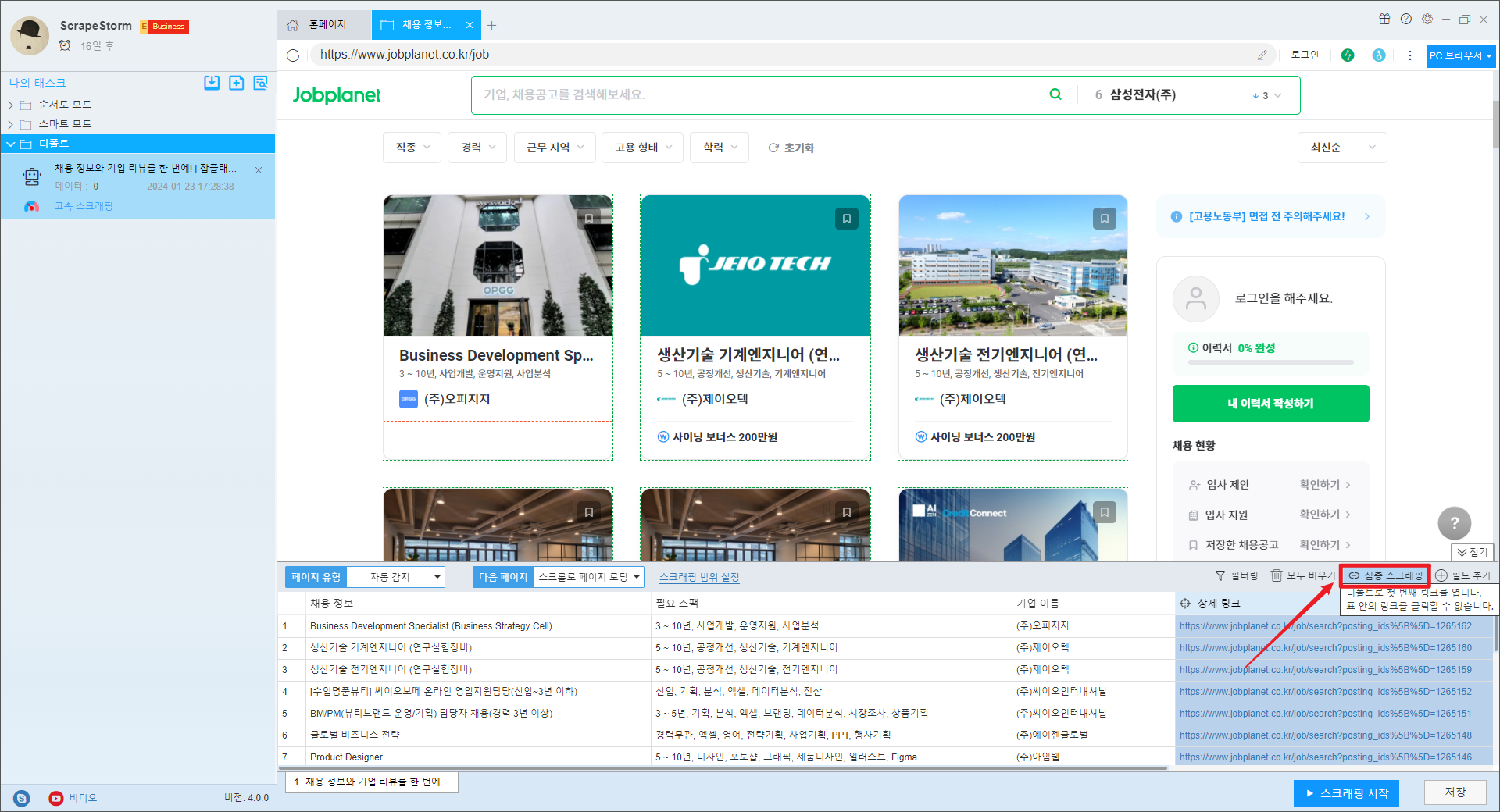 각 회사의 자세한 채용 정보를 수집하려면 오른쪽의 "심층 스크래핑" 을 클릭하여 상세 페이지로 들어가 구체적인 관련 내용을 스크랩하세요.