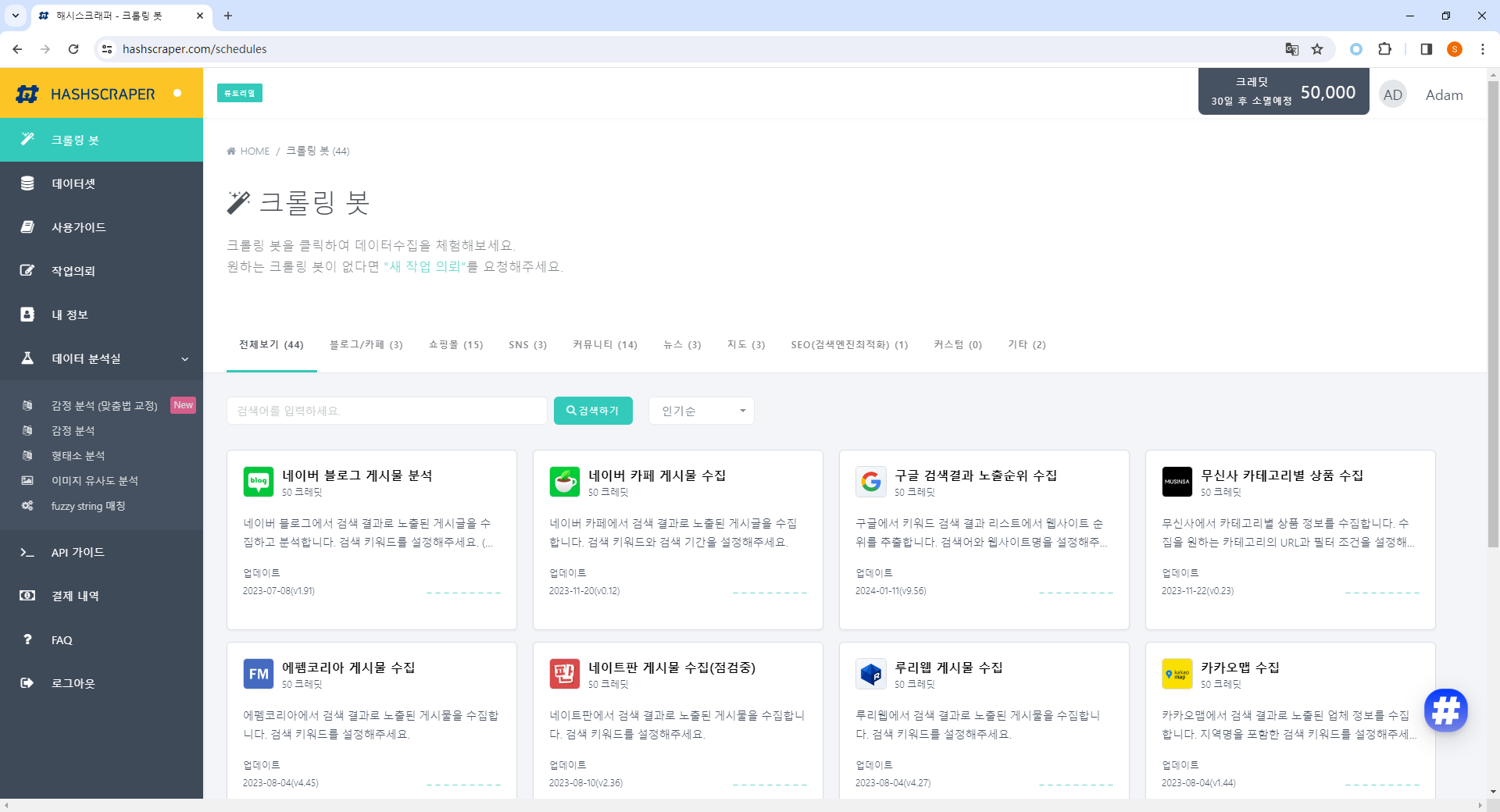 HashScraper는 전문 사용자와 기업을 대상으로 한 데이터 수집 도구로, 맞춤형 수집 작업과 복잡한 데이터 처리를 지원합니다. 사용자는 프로그래밍이나 수집 템플릿을 사용하여 필요한 데이터를 크롤링할 수 있지만, 이는 일정한 기술 지식이 필요할 수 있습니다.