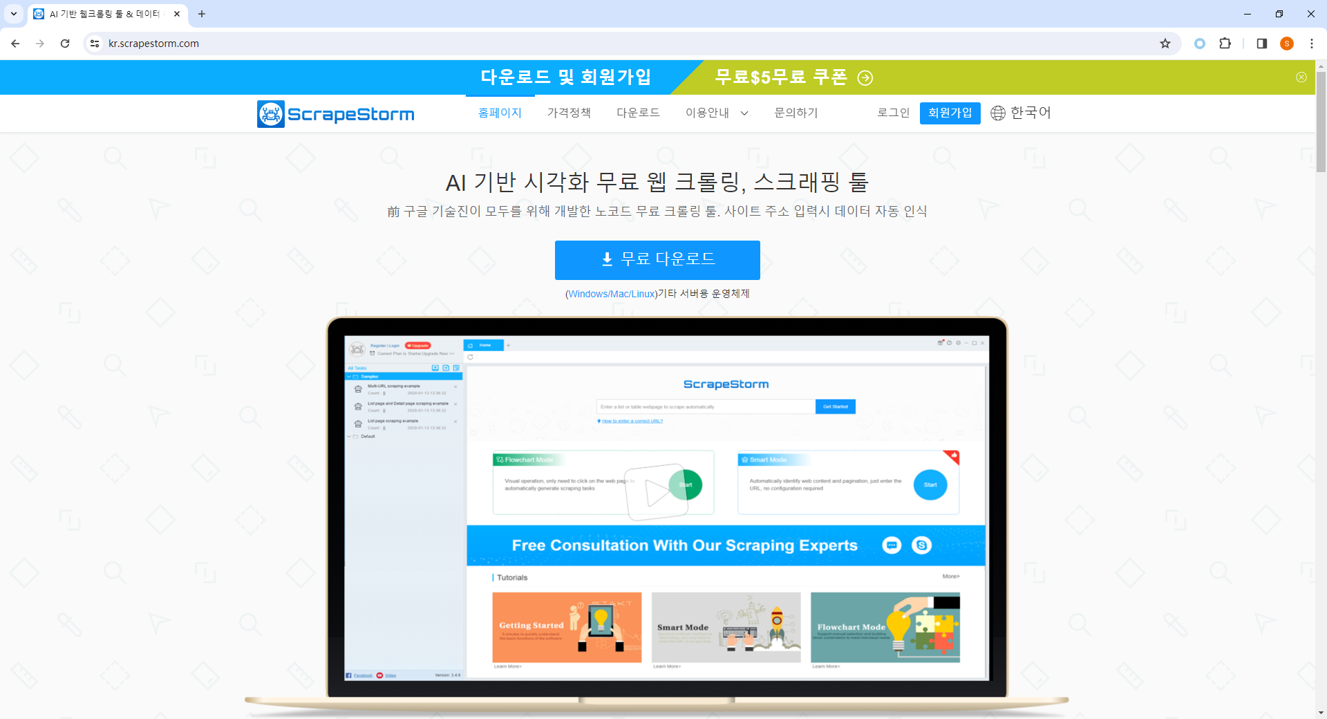ScrapeStorm은 사용자에게 강력하면서도 직관적인 인터페이스를 제공하는, AI 기반의 데이터 수집 도구입니다. 프로그래밍 지식이 없어도 작동할 수 있으며, 스마트 모드와 순서도 모드를 지원합니다. 단순한 웹페이지부터 복잡한 웹페이지까지, 사용자는 두 가지 스크래핑 모드를 통해 온라인상에 있는 99%의 웹페이지를 수집할 수 있습니다.