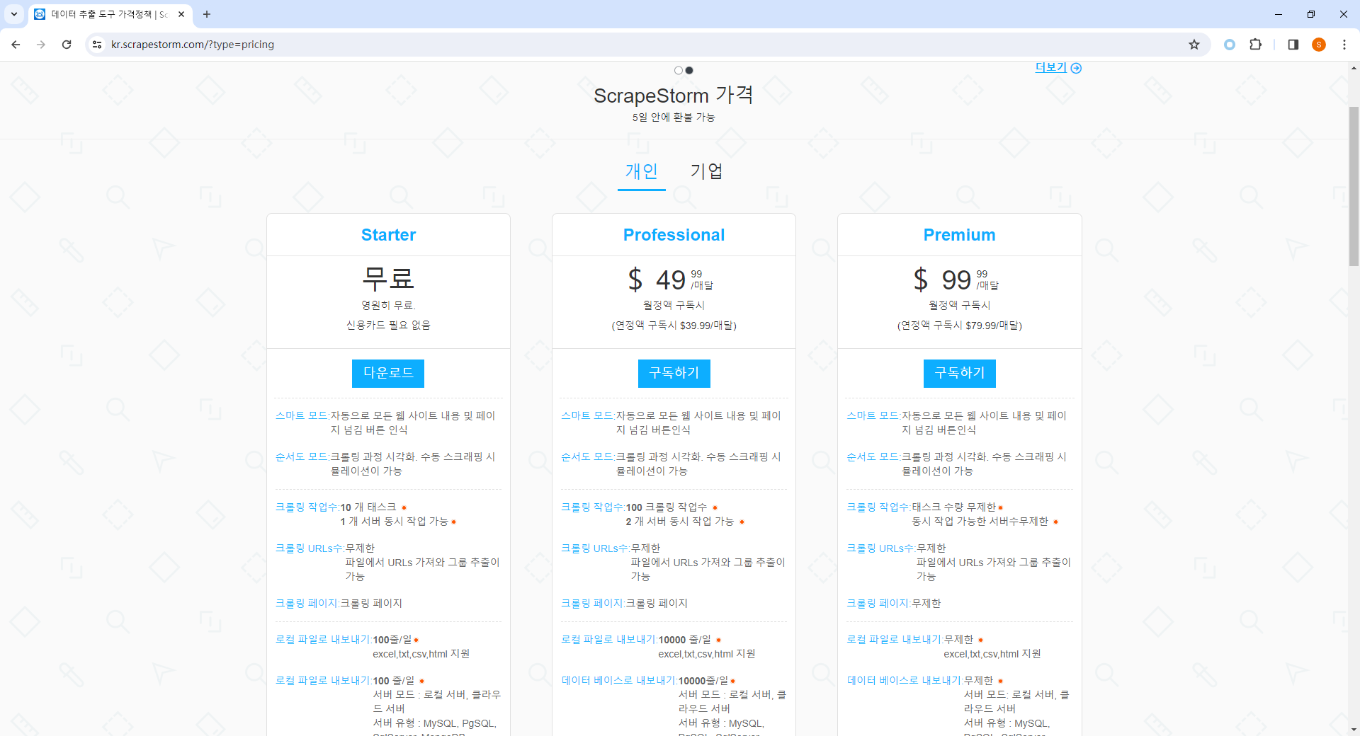 ScrapeStorm은 무료 버전과 다양한 패키지를 제공합니다. 무료 버전만으로도 대부분의 사용자의 기본 요구를 충족시켜, 예산이 제한된 사용자에게 이상적인 선택이 됩니다. 고급 기능과 더 큰 데이터 처리가 필요한 사용자를 위해, ScrapeStorm의 패키지은 확장 가능한 옵션을 제공하여 사용자가 자신의 요구와 예산에 맞는 적절한 서비스 를 선택할 수 있도록 합니다.